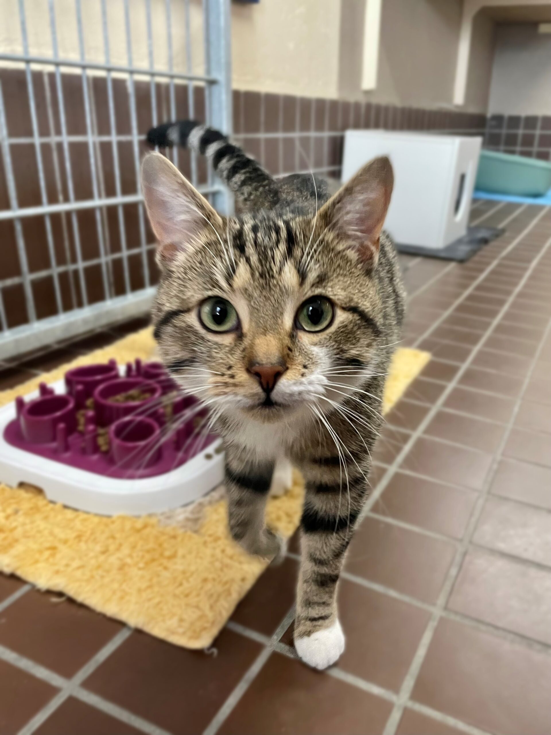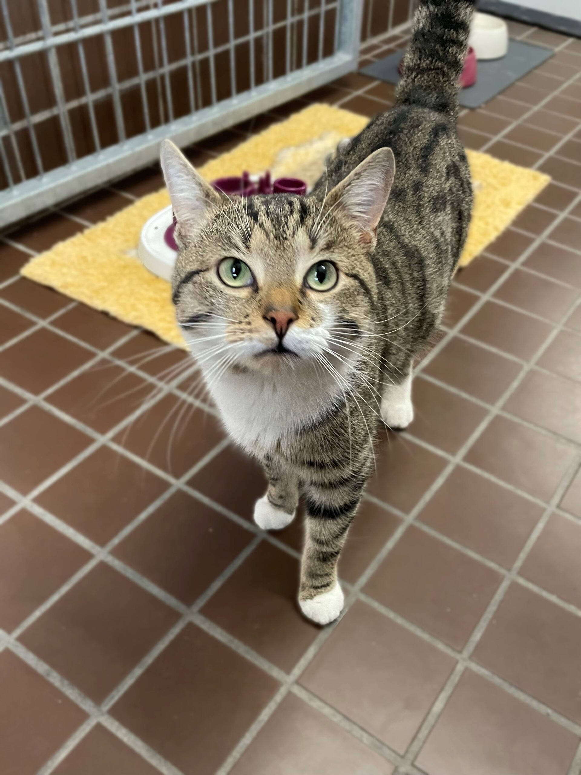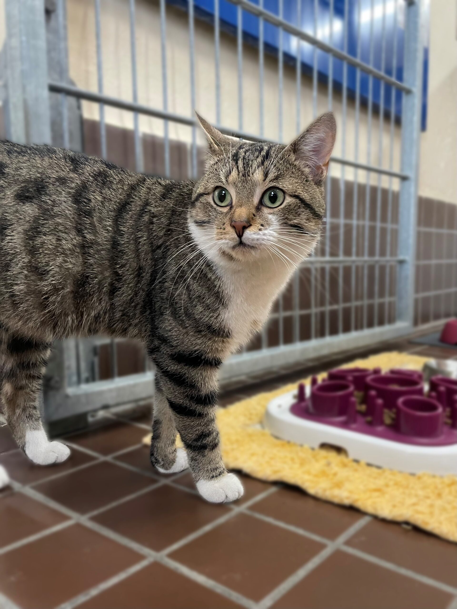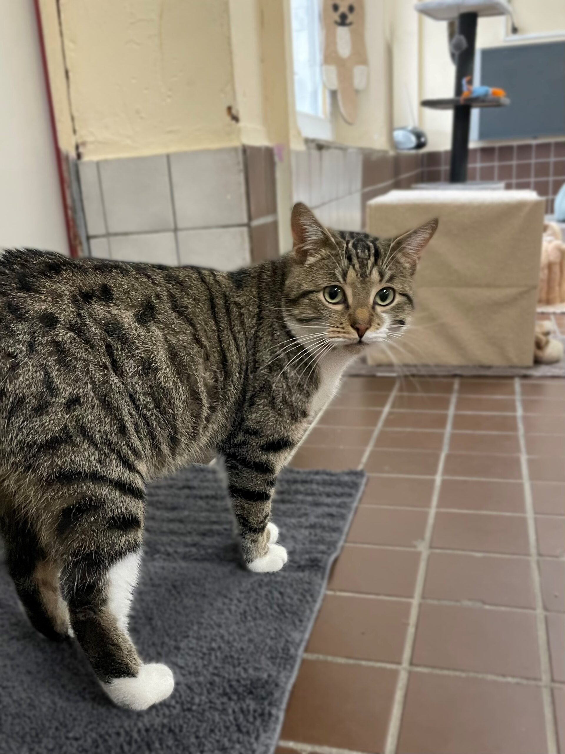 Optisch ist er ein echter Hingucker: weiß mit klassischer Tigerzeichnung, ausdrucksstarken Augen und einem wachen, klugen Blick. Matheo ist neugierig, aufmerksam und möchte seine Umgebung gerne im Blick behalten. Er beobachtet genau, was um ihn herum passiert, und trifft seine Entscheidungen überlegt – ein echter Stratege!